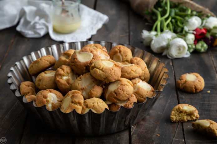 7) Ψήνουμε σε προθερμασμένο φούρνο στους 180°C στον αέρα, για περίπου 18 λεπτά μέχρι να χρυσίσουν. Για να είμαστε σίγουροι για το αποτέλεσμα, καλύτερα να τα ψήσουμε σε δύο δόσεις ώστε να βάλουμε το κάθε ταψί στη μεσαία σχάρα. Τα αφήνουμε να κρυώσουν εντελώς σε θερμοκρασία δωματίου.