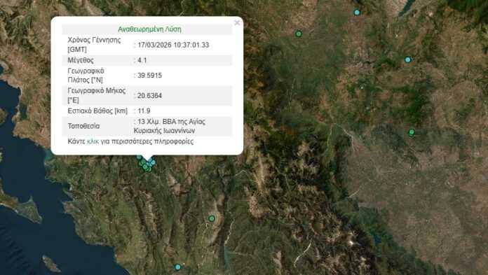Σεισμός τώρα με μέγεθος 4,1 στην κλίμακα Ρίχτερ σημειώθηκε σήμερα στις 12:37, με επίκεντρο 13 χλμ. ΒΒΑ της Αγίας Κυριακής Ιωαννίνων, σύμφωνα με ανακοίνωση του Γεωδυναμικού Ινστιτούτου του Εθνικού Αστεροσκοπείου Αθηνών. Ο σεισμός έγινε σε απόσταση 322 χλμ. ΒΔ των Αθηνών. Το εστιακό βάθος του σεισμού εντοπίζεται στα 11,9 χιλιόμετρα.
