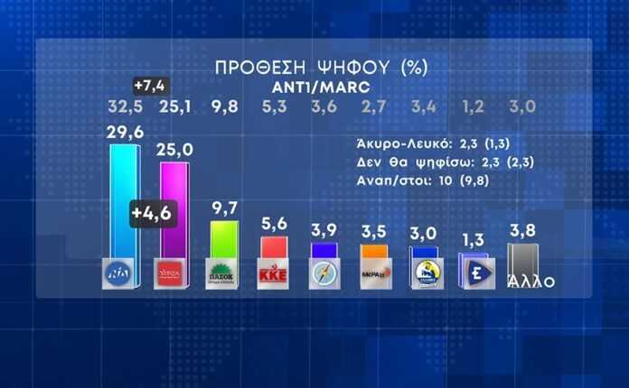 Για την ιστορία, η δημοσκόπηση της Marc καταγράφει τη διαφορά μεταξύ ΝΔ και ΣΥΡΙΖΑ να περιορίζεται μόλις στο 4,5%, τη δημοτικότητα του Κυριάκου Μητσοτάκη να μειώνεται κατά περίπου 10%, τη συνολική αξιολόγηση της κυβέρνησης να είναι αρνητική με 42% θετικές γνώμες και 56% αρνητικές, αλλά (φυσικά), τον Κυριάκο Μητσοτάκη να διατηρεί το προβάδισμά του στην ερώτηση «ποιον από τους πολιτικούς αρχηγούς εμπιστεύεστε περισσότερο», λαμβάνοντας ποσοστό 34,5%, έναντι 22,1% του Αλέξη Τσίπρα.