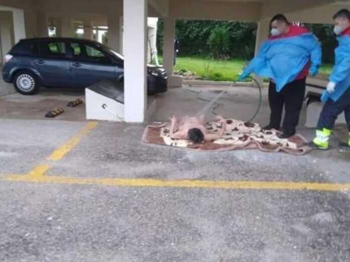 Οργισμένες αντιδράσεις προκάλεσε εικόνα που νοσηλευτές στον Ωρωπό πλένουν με λάστιχο σε πιλοτή πολυκατοικίας 70χρονη ασθενή.
