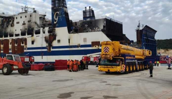 Ολοκληρώθηκε η απομάκρυνση των καμένων οχημάτων και φορτηγών (περίπου 70) από το δεύτερο και τέταρτο γκαράζ του επιβατηγού οχηματαγωγού πλοίου «Euroferry Olympia», που βρίσκεται στο λιμάνι του Αστακού.