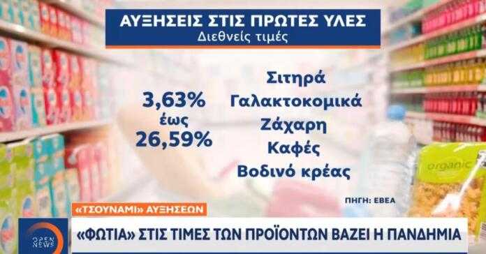 Η αύξηση των τιμών σε πρώτες ύλες όπως σιτηρά, γαλακτοκομικά, ζάχαρη, καφέ και βοδινό κρέας ξεκινά από 3,63% και φτάνει το 26,59% σύμφωνα με τα στοιχεία του Εμπορικού και Βιομηχανικού Επιμελητηρίου Αθηνών (ΕΒΕΑ).