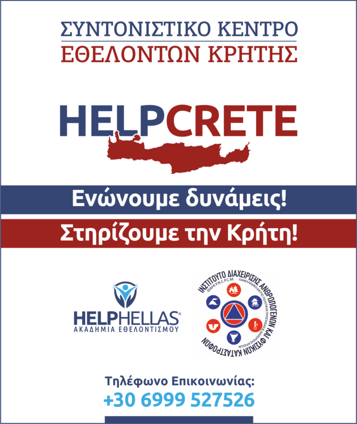 “Στο Συντονιστικό Κέντρο Εθελοντών Κρήτης (τηλ. 6999 527526) που λειτουργεί η HELPHELLAS από 8/10/21 σε συνεργασία με το ΙΔΑΦΚ στο κτίριο της Παλαιάς Ηλεκτρικής στις Αρχάνες που παραχώρησε ο Δήμος Αρχανών – Αστερουσίων, μπορείτε να απευθύνεστε για :