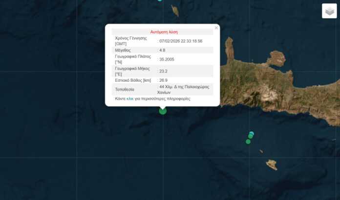 Σεισμός μεγέθους 3,8 ρίχτερ σημειώθηκε στην Κρήτη. Η δόνηση σημειώθηκε στις 00:33 και είχε επίκεντρο 44 χλμ. δυτικά της Παλαιοχώρας Χανίων.