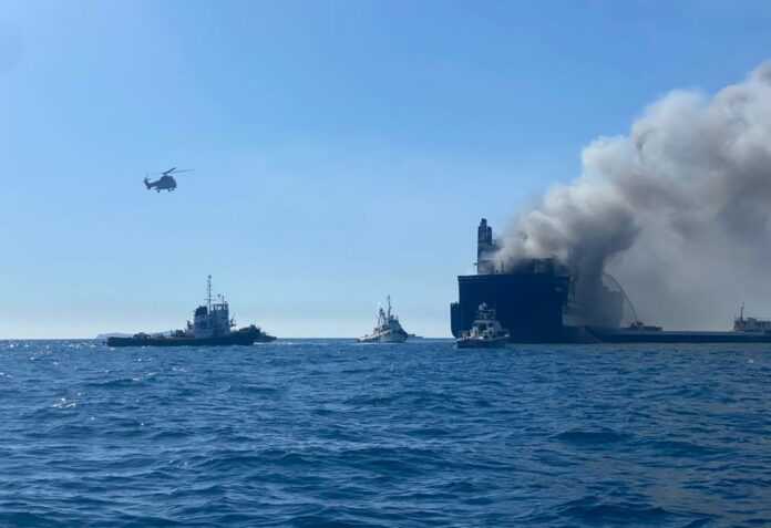 Στο σημείο όπου είναι σε εξέλιξη το συμβάν βρίσκεται ένα πλοίο με πυροσβεστικά οχήματα που κάνουν συνεχείς ρίψεις νερού στο πλοίο, αλλά και ένα ρυμουλκό που επιχειρεί και αυτό στην κατάσβεση της φωτιάς.