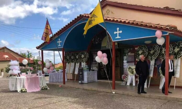 Από το πρωί στο σπίτι της οικογένειας είχαν συγκεντρωθεί πολλοί συγγενείς και φίλοι. Τραγικές φιγούρες οι γονείς της μικρούλας. Ο στολισμός της εκκλησίας που τελείται η νεκρόσιμος ακολουθία παραπέμπει σε βάφτιση κι όχι σε κηδεία αφού στον προαύλιο χώρο του ναού υπάρχουν ροζ και άσπρα μπαλόνια, ενώ σε δύο τραπέζια έχουν τοποθετηθεί κουφέτα και γλυκίσματα.