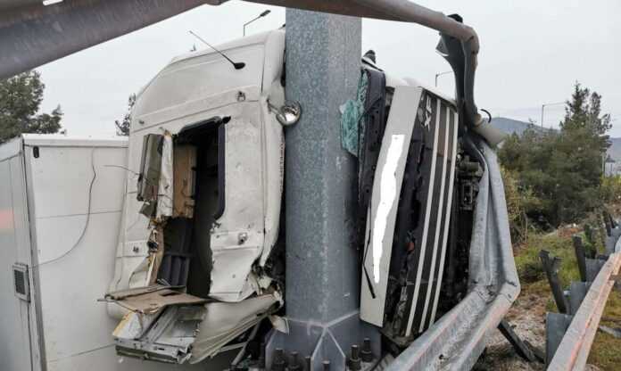 Όλα έγιναν όταν νταλίκα που κινούνταν στο ρεύμα προς Αθήνα – στο ύψος του κόμβου Γυρτώνης – υπό άγνωστες συνθήκες βγήκε εκτός πορείας με αποτέλεσμα να προσκρούσει σε μια κολόνα.