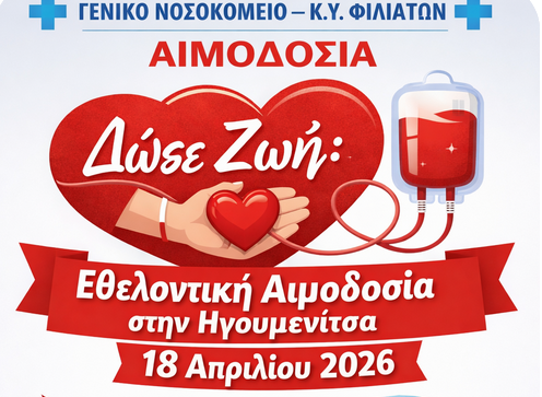 Μια σημαντική πράξη αλληλεγγύης και κοινωνικής προσφοράς διοργανώνει η Αιμοδοσία του Γενικού Νοσοκομείου – Κέντρου Υγείας Φιλιατών, καλώντας τους πολίτες της Θεσπρωτίας σε εθελοντική αιμοδοσία. Σύμφωνα με το typosepeirou.gr, η δράση θα λάβει χώρα το Σάββατο 18 Απριλίου 2026 στο κτίριο ΠΑΝΘΕΟΝ στην Ηγουμενίτσα, από τις 09:30 έως τις 13:30. Σε μια περίοδο όπου οι ελλείψεις σε αποθέματα αίματος αποτελούν μόνιμη πρόκληση για το εθνικό σύστημα υγείας, η Διοικήτρια του νοσοκομείου, Ηλιάνα Καϊντάση, υπογραμμίζει τη σημασία της συμμετοχής όλων. Η διαδικασία απαιτεί μόλις 10 λεπτά από τον χρόνο του κάθε εθελοντή, ικανά όμως να σώσουν ανθρώπινες ζωές και να προσφέρουν ελπίδα σε ασθενείς που το έχουν ανάγκη. Το Νοσοκομείο Φιλιατών προσκαλεί παλιούς και νέους αιμοδότες να δώσουν δυναμικό παρών, αποδεικνύοντας έμπρακτα την ευαισθησία της τοπικής κοινωνίας.