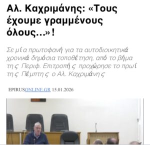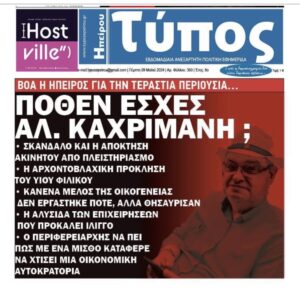 Χρειάστηκε αγώνας πολλών χρόνων για να αρχίσει να διαφαίνεται κάποιο φως στην βυθισμένη στην αδιαφανή, παράνομη και σκανδαλώδη διοίκηση της Ηπείρου από τον Αλ. Καχριμάνη και από μιά πέριξ αυτού ομάδα, ένα άθλιο σύστημα που ανήγαγε την φαυλότητα σε … επάγγελμα και μάλιστα αρκετά προσοδοφόρο για πολλούς.