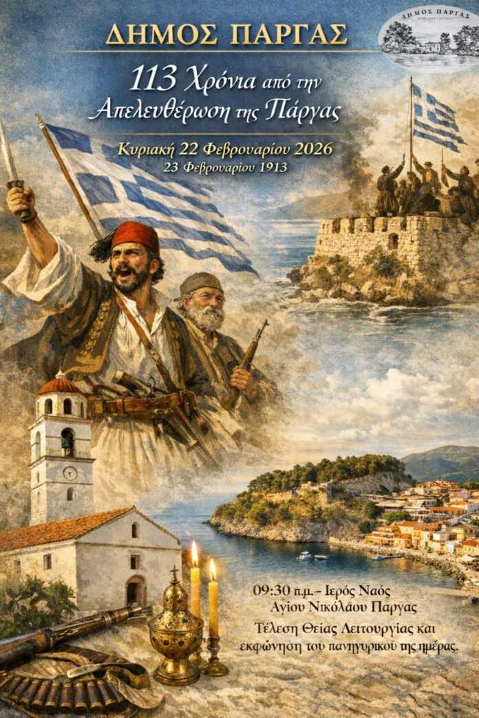 Ο Δήμος Πάργας διοργανώνει επετειακές εκδηλώσεις για να τιμήσει το τέλος της οθωμανικής δουλείας, καλώντας πολίτες και φορείς να παραστούν την Κυριακή 22 Φεβρουαρίου 2026 στον Ιερό Ναό του Αγίου Νικολάου. Στις 09:30 το πρωί θα ξεκινήσει το τελετουργικό με την επιμνημόσυνη δέηση, ενώ ο πανηγυρικός λόγος που θα ακολουθήσει θα ανασύρει μνήμες από τους ηρωικούς αγώνες που οδήγησαν στην ελευθερία.