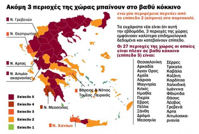 Οι 27 περιοχές της χώρας οι οποίες είναι πλέον σε βαθύ κόκκινο (επίπεδο 5) είναι: