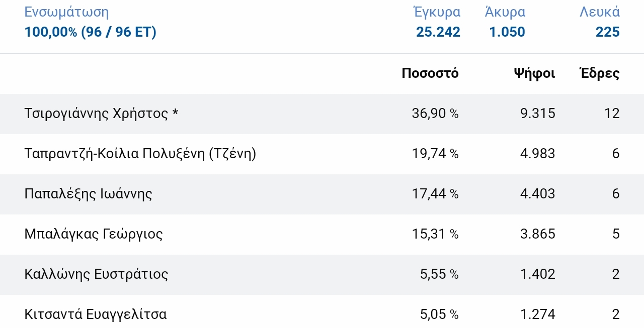 Χθες, στον πρώτο γύρο των εκλογών, εν ενεργεία Δήμαρχος, με καταμετρημένο το 100% των ψηφοδελτίων, στα 96 επί συνόλου 96 Εκλογικών Τμημάτων, έλαβε 9.315 ψήφους, ποσοστό 36,9% και καταλαμβάνει 12 έδρες στο νέο Δημοτικό Συμβούλιο, ενώ η Τζένη έρχεται δεύτερη με 4.983 ψήφους, ποσοστό 19,74% και παίρνει 6 έδρες.