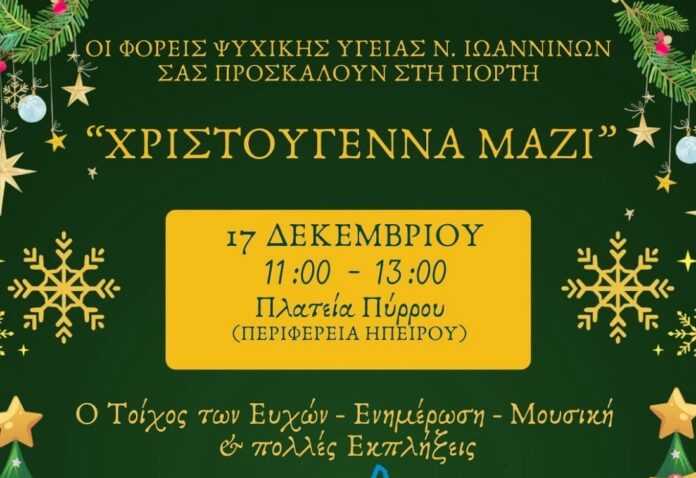 Οι φορείς ψυχικής υγείας του Νομού Ιωαννίνων ενώνουν για άλλη μια χρονιά τις δυνάμεις τους, στέλνοντας ένα ηχηρό μήνυμα αλληλεγγύης και κοινωνικής αποδοχής ενόψει των εορτών. Την Τετάρτη 17 Δεκεμβρίου, από τις 11 το πρωί έως τη 1 το μεσημέρι, έξω από το κτίριο της Περιφέρειας Ηπείρου, διοργανώνεται η κοινή χριστουγεννιάτικη εκδήλωση με τίτλο «Χριστούγεννα μαζί». Αυτή η πρωτοβουλία στοχεύει να φέρει πιο κοντά την κοινότητα και να τονίσει τη σημασία της συνύπαρξης και της αποδοχής όλων των μελών της.