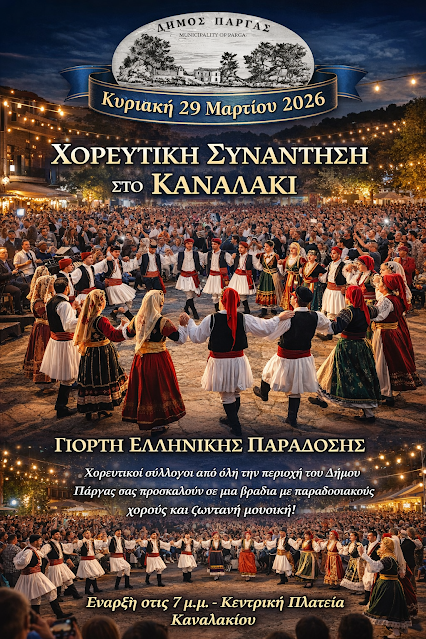 Ο Δήμος Πάργας διοργανώνει την Κυριακή 29 Μαρτίου 2026 στις 7:00μ.μ χορευτική συνάντηση στην κεντρική πλατεία του Καναλάκι, με τη συμμετοχή χορευτικών συλλόγων από όλη την περιοχή του Δήμου.