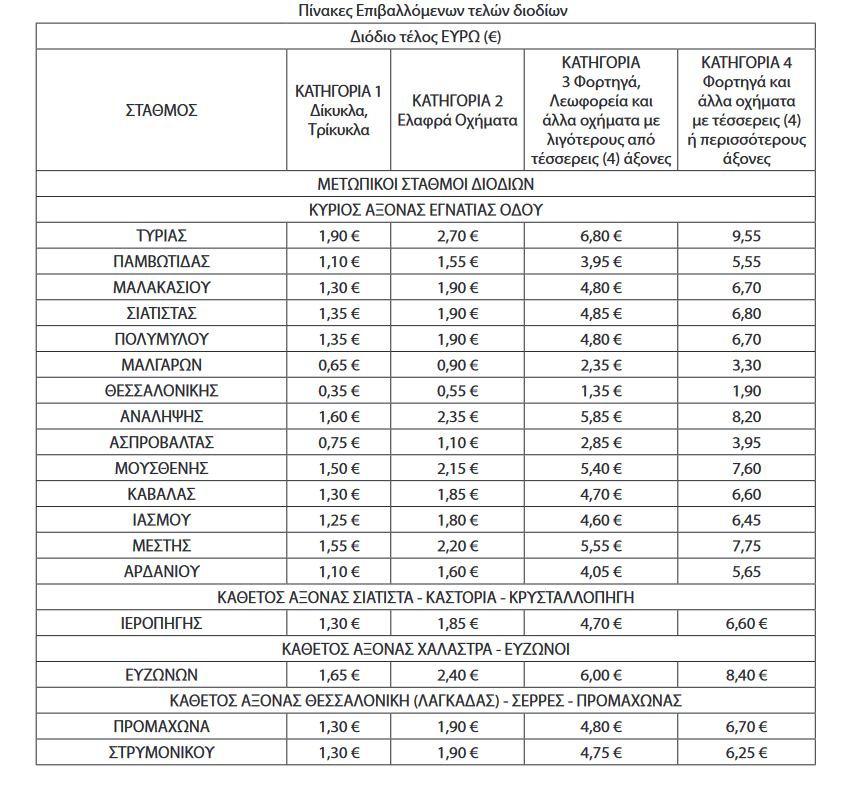 Τα νέα διόδια της Εγνατίας Οδού, διαμορφώνονται ως εξής: