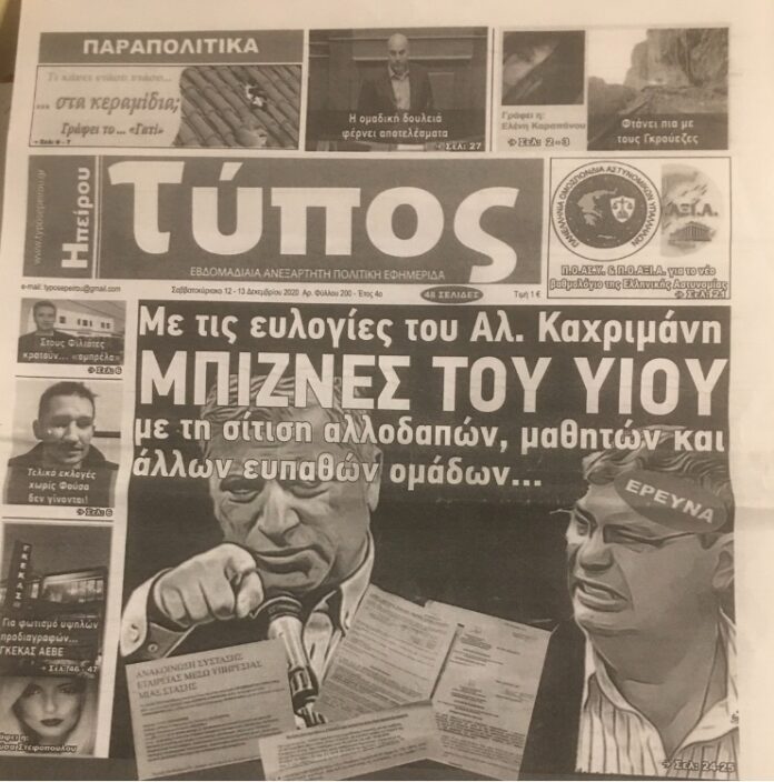 Συζητήθηκε χθες Τετάρτη 5 Απριλίου η αγωγή του Περιφερειάρχη Αλέξ. Καχριμάνη και του γιού του Γεωργίου, κατά του δημοσιογράφου Κώστα Δ.Καλτσή και της Ελένης Καραπάνου- Λίγκα, εκδότριας της εφημερίδας «Τύπος Ηπείρου».