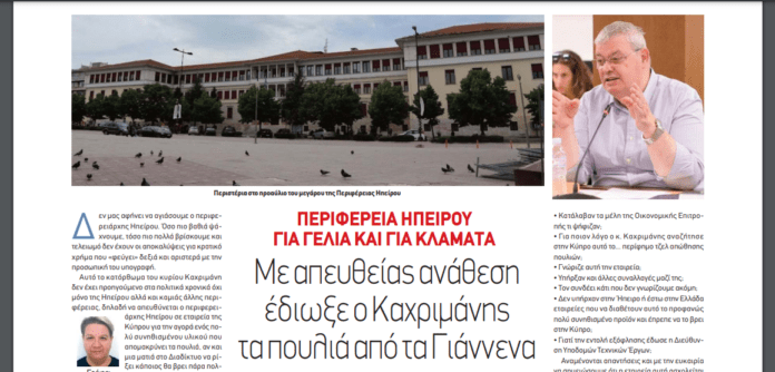 επενδύσεις. Τι δουλειά είχε ο περιφερειάρχης Ηπείρου Αλέξανδρος Καχριμάνης να απευθυνθεί σε κυπριακή εταιρεία; Να υποθέσουμε ότι είχε Θεία Φώτιση (αφού μιλάει και με τον… Θεό); Μάλλον αποκλείεται αυτό το σενάριο. Συνεπώς γνωρίζει την εταιρεία και μένει να μας πει αν συνεργάζεται με αυτήν καθ’ οιονδήποτε τρόπο, αυτός ή μέσω των οικογενειακών του επιχειρήσεων… Πάντως, το ευτύχημα είναι πως αυτήν τη φορά η απευθείας ανάθεση δεν αφορούσε την πρόσληψη κάποιου εξειδικευμένου ατόμου στην