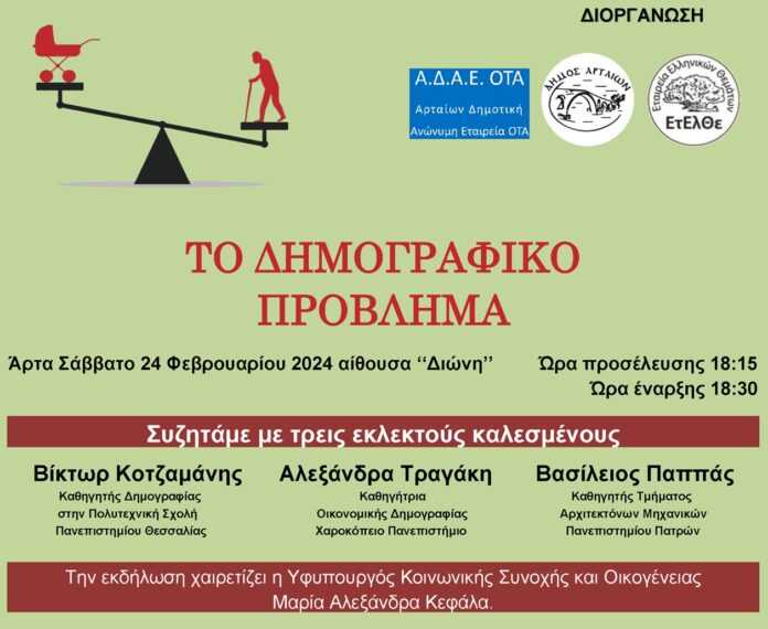 1. H ΕΤ.ΕΛ.ΘΕ. σε συνεργασία με τον Δήμο Αρταίων διοργανώνει δημόσια συζήτηση με θέμα ¨το Δημογραφικό Πρόβλημα¨ στις 24 Φεβρουαρίου 2024 ημέρα Σάββατο στην αίθουσα της ΑΔΑΕ “ΔΙΩΝΗ’’ με ώρα προσέλευσης 18:15 και ώρα έναρξης 18:30 .