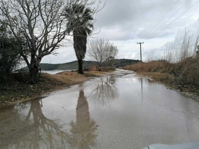Στα σημεία όπου έχει αποψιλωθεί η βλάστηση για να τοποθετηθούν τους καλοκαιρινούς μήνες καντίνες και να δημιουργηθούν θέσεις στάθμευσης, τα νερά της θάλασσας βγήκαν στο δρόμο, μεταφέροντας άμμο και ενώνοντας ουσιαστικά τη θάλασσα με την παρακείμενη λιμνοθάλασσα.