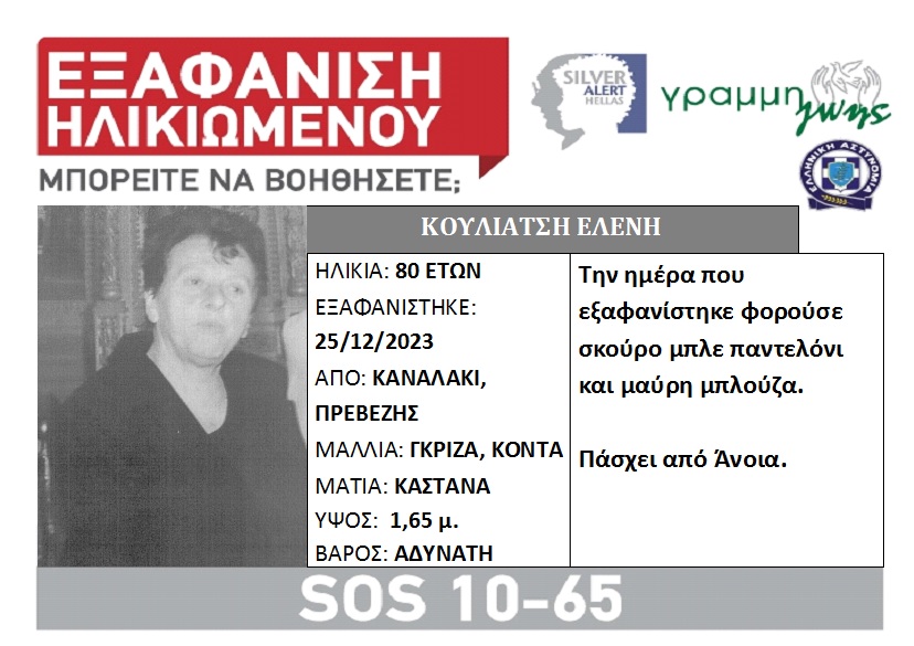 Η Ελένη Κουλιάτση, 80 ετών, εξαφανίστηκε από το σπίτι στο οποίο φιλοξενούνταν, στο Καναλάκι Πρεβέζης, το πρωί της 25/12/23.