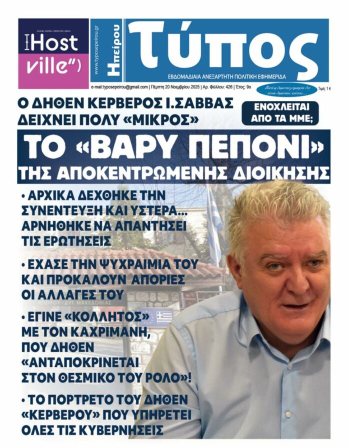 Δεν τρέφει όμως μένος μόνο κατά της Βάσως Σκουλίκα ο Γενικός Γραμματέας της Αποκεντρωμένης Διοίκησης, αλλά και εναντίον μας και του «Τύπο της Ηπείρου» και όποιου άλλου δεν τον υμνεί, μέχρι και του «Πρωϊνού Λόγου»! Θα δείτε για ποιόν λόγο το λέμε και γιατί αποδεικνύεται «μικρός». Έδωσε μιά συνέντευξη στον Βλάσση Ντόκα (ITV) πριν από ένα μήνα και κάτι. Δυό ημέρες αργότερα (16/10/25) ξαναγράφαμε ότι ο Γενικός Γραμματέας της Αποκεντρωμένης Διοίκησης κ.Ιωάννης Σάββας, παρέπεμψε (όπως είχε υποχρέωση εκ του νόμου) τον κ.Καχριμάνη στο Πειθαρχικό Συμβούλιο για τα δεκατέσσερα πειθαρχικά (με τα ποινικά να τα εξετάζουν οι Εισαγγελείς) παραπτώματα που διαπίστωσε η Εθνική Αρχή Διαφάνειας, αλλά είναι άγνωστο πότε θα συνεδριάσει.