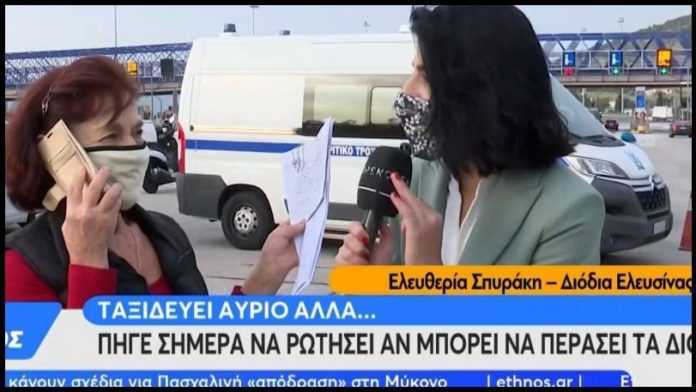 Η κ. Σοφία μένει στο Θησείο και θέλει να ταξιδέψει αύριο για Πρέβεζα. Επειδή όμως χθες καλούσε διαρκώς στα τηλέφωνα να μάθει αν θα μπορεί να πάει σε άλλο νομό και κανείς δεν της απαντούσε, αποφάσισε να δράσει άμεσα. Έτσι πήρε το αυτοκίνητό της και πήγε να ρωτήσει την Αστυνομία στα διόδια Ελευσίνας.
