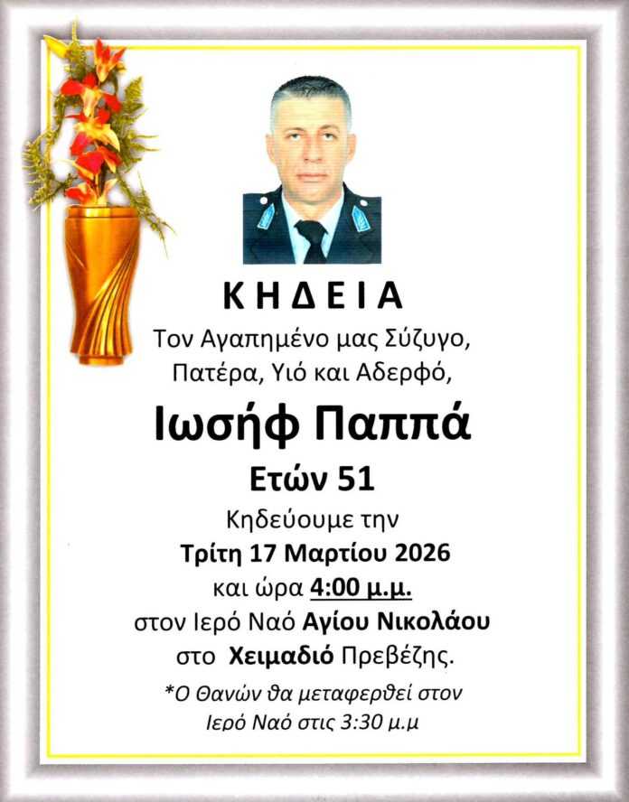 Σήμερα στις 4:00 στο Χειμαδιό Πρέβεζας το τελευταίο αντίο στον αστυνομικό Ιωσήφ Παππά.
