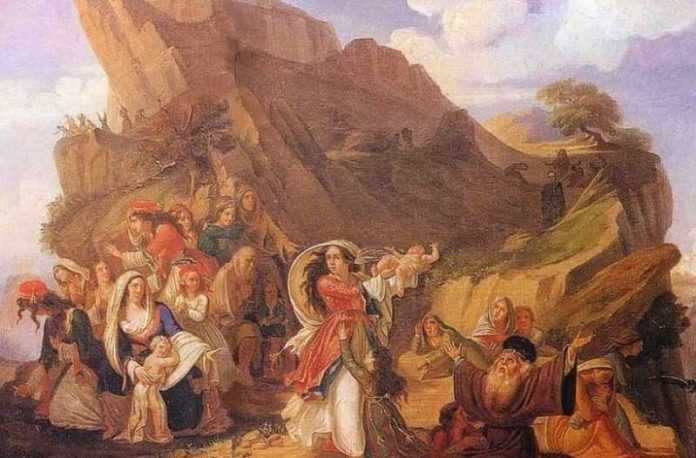 Στο τέλος των επωδών, οι γυναίκες βγάζουν μία διαπεραστική και μακρόσυρτη κραυγή, που ο αντίλαλός της σβήνει στο βάθος ενός τρομακτικού γκρεμού, όπου ρίχνονται μαζί με όλα τα παιδιά τους».