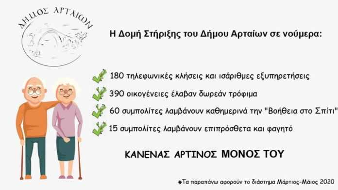 Ο Δήμος Αρταίων από την πρώτη στιγμή που ξέσπασε η υγειονομική κρίση, ανέλαβε αυτόνομες πρωτοβουλίες αλλά και δράσεις σε συνέχεια κυβερνητικών αποφάσεων, για την στήριξη του γενικού πληθυσμού αλλά και των ευπαθών ομάδων.