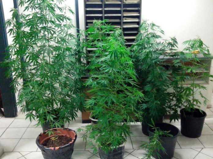 - στον προαύλιο χώρο του σπιτιού, (9) δενδρύλλια κάνναβης σε πρώιμη ανάπτυξη, φυτεμένα σε γλάστρες.