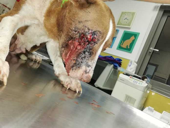 Η σκυλίτσα έχει χάσει την όραση από το αριστερό της μάτι, έχει τρύπα στο μάγουλο από την πληγή που προκάλεσε ο πυροβολισμός και έχει και σπασμένη γνάθο…