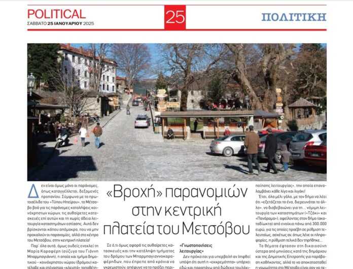 Δεν είναι όμως μόνο οι παράνομες, όπως καταγγέλλεται, δεξαμενές προπανίου. Σύμφωνα με το πρωτοσέλιδο του «Τύπος Ηπείρου»», το Μέτσοβο βοά για τις παράνομες καταλήψεις κοινόχρηστων χώρων, τις αυθαίρετες κατασκευές επί αυτών και τη χωρίς άδεια λειτουργία καταστημάτων εστίασης. Αυτά δεν βρίσκονται κάπου απόμακρα, που να μην προκαλούν οι παρανομίες, αλλά στο κέντρο του Μετσόβου, στην κεντρική πλατεία! Παρ’ όλα αυτά, όμως ουδείς ενοχλεί τη Μαρία Καραφέρη (σύζυγο του Γιάννη Μπαρμπαγιάννη), η οποία και τμήμα δημοτικού – κοινόχρηστου χώρου (δρόμου) κατέλαβε και στέγαστρα «κλειστά» τοποθέτησε χωρίς άδεια!