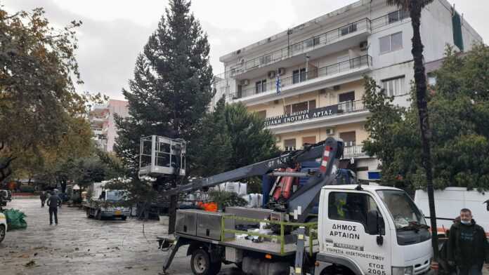 σήμερα οι εργασίες τοποθέτησης του Χριστουγεννιάτικου δέντρου στην Κεντρική Πλατεία της Άρτας δίνοντας έτσι μία νότα εορταστική στην όμορφη πόλη.