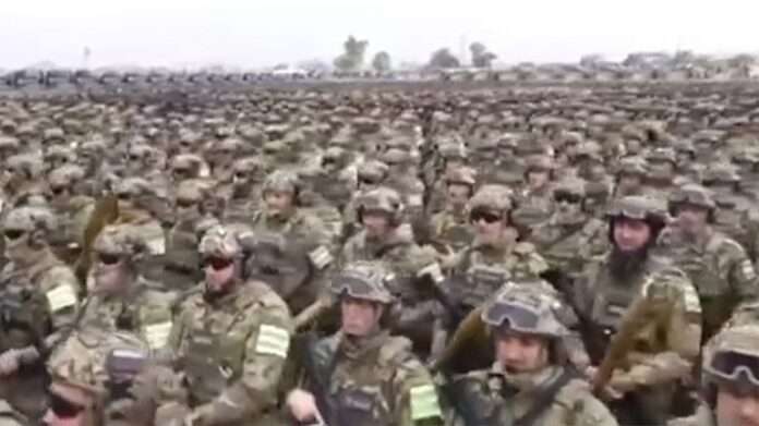 Χιλιάδες Τσετσένοι φαίνονται σε βίντεο, που κάνει τον γύρο του διαδικτύου, να έχουν παραταχθεί πάνοπλοι σε μία τεράστια έκταση έτοιμοι να αναχωρήσουν για τον πόλεμο στο πλευρό των Ρώσων ενάντια στην Ουκρανία.
