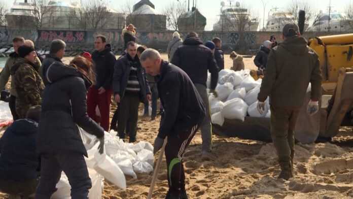 Εθελοντές συγκεντρώνονται σε μια παραλία στην Οδησσό για να γεμίσουν σάκους με άμμο και να τους στείλουν στον στρατό για οχυρωματικά έργα.