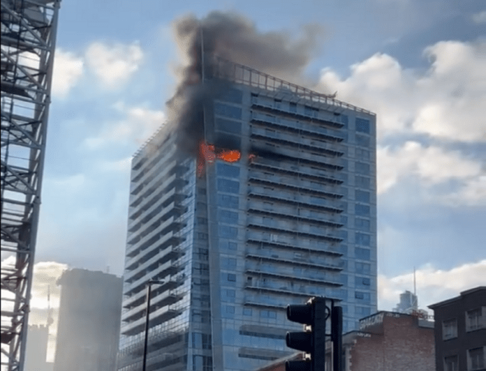 Σε ένα βίντεο που αναρτήθηκε στην ίδια πλατφόρμα διακρίνονται φλόγες και καπνός να υψώνονται από το πολυώροφο κτίριο.