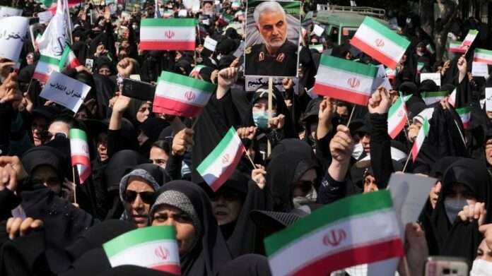 “Θάνατος στους συνωμότες”, “Το τέλος της μαντίλας, αυτή είναι η πολιτική των Αμερικανών”, έλεγαν μερικά συνθήματα.