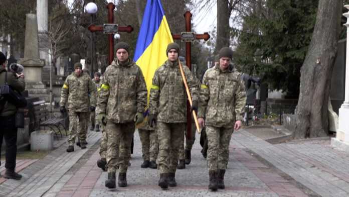 Τρεις πεσόντες Ουκρανοί στρατιώτες θάβονται στο Lviv, στη δυτική Ουκρανία, με τους συντρόφους και τους συγγενείς τους να βρίσκονται εκεί για να θρηνήσουν τον θάνατό τους.