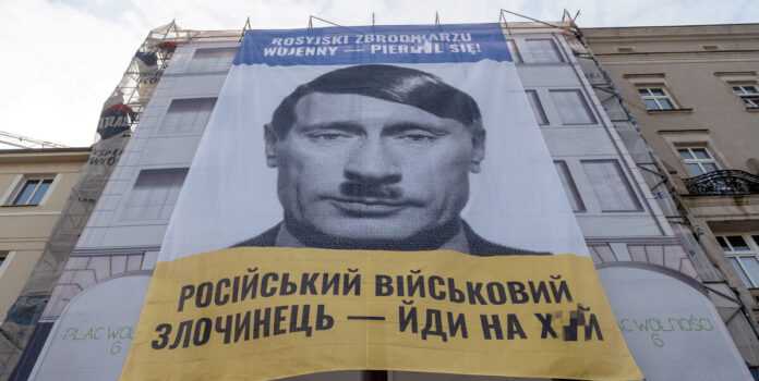 Ένα πανό με τον Βλαντιμίρ Πούτιν εμφανιζόμενο ως Αδόλφο Χίτλερ, αναρτήθηκε σε μια πολυκατοικία στην Πλατεία Ελευθερίας στο Πόζναν, στα δυτικοκεντρικά της Πολωνίας.