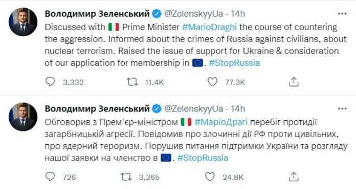 “Συζήτησα με τον Ιταλό Πρωθυπουργό Mario Draghi την πορεία αντιμετώπισης της επιθετικότητας (της Ρωσίας). Ενημερώθηκε για τα εγκλήματα της Ρωσίας κατά αμάχων (και) για την πυρηνική τρομοκρατία. Τέθηκε το θέμα της υποστήριξης της Ουκρανίας και την εξέταση της αίτησής μας για ένταξη στην ΕΕ.”