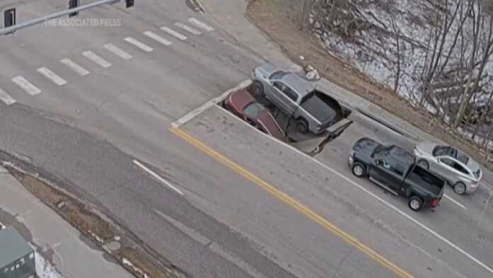 Βίντεο από κάμερα ασφαλείας κατέγραψε τη στιγμή που δρόμος σε πολυσύχναστη διασταύρωση στη Νεμπράσκα καταπίνει – κυριολεκτικά – δύο αυτοκίνητα.