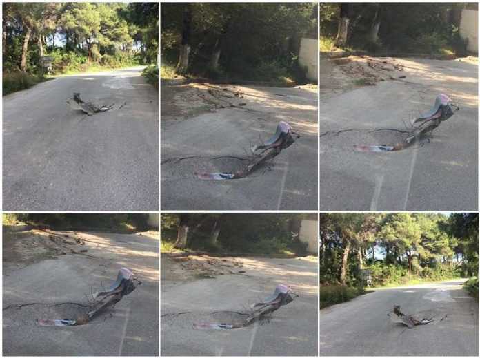 Όπως βλέπετε και στις φωτογραφίες που μας έστειλε αναγνώστρια μας, ο δρόμος έχει υποστεί καθίζηση και για να μην σκοτωθεί κανείς, έχουν βάλει ένα κλαρί δέντρου και μια αφίσα…