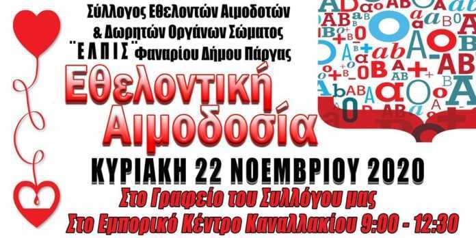 Εθελοντική αιμοδοσία διοργανώνει την Κυριακή 22 Νοεμβρίου ο σύλλογος εθελοντών αιμοδοτών και δωρητών οργάνων σώματος «Ελπίς» Φαναρίου – Πάργας.