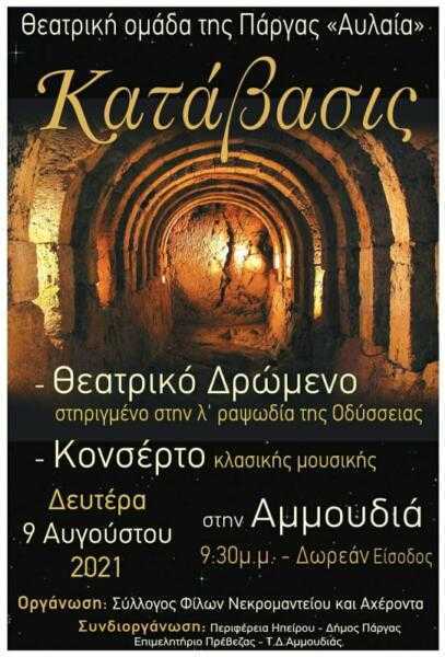 Ο σύλλογος Φίλων του Νεκρομαντείου και του Αχέροντα διοργανώνει την εκδήλωση «Κατάβασις» στις εκβολές του Αχέροντα στην Αμμουδιά την Δευτέρα 9/8/2021 και ώρα 9.30 μ.μ. με ελεύθερη είσοδο. Η εκδήλωση περιλαμβάνει: