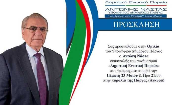 Με σύνθημα «Με όραμα και δύναμη συνεχίζουμε!! Εμείς μπορούμε» ο δήμαρχος και εκ νέου υποψήφιος κ. Αντώνης Νάστας, πραγματοποιεί σήμερα Πέμπτη 23 Μαΐου στις 21.00 στην παραλία της Πάργας (Στην Άγκυρα) την κεντρική προεκλογική του ομιλία.