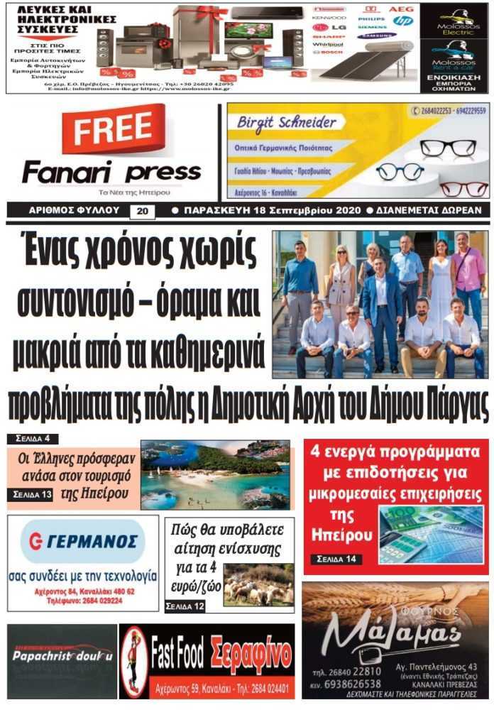 ΑρχικήΠάργαΠρωτοσέλιδο της εφημερίδα Fanari Free Press που κυκλοφορεί αύριο Παρασκευή 18/9/20