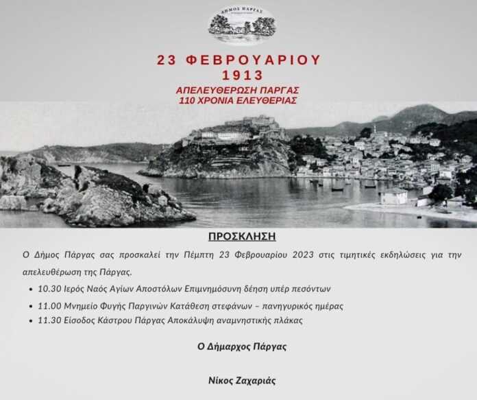 Ο Δήμος Πάργας την Πέμπτη 23 Φεβρουαρίου 2023 θα εορτάσει την επέτειο 110 ετών από την Απελευθέρωση της Πάργας από τους Οθωμανούς, έπειτα από την απόφαση του Δημοτικού Συμβουλίου που καθορίζει τις ημερομηνίες απελευθέρωσης των Δημοτικών Ενοτήτων Φαναρίου και Πάργας.