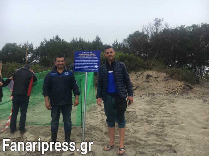 Άμεσα τοποθετήθηκε και πινακίδα στο σημείο προς ενημέρωση των λουόμενων για την παρουσία της φωλιάς στην παραλία.